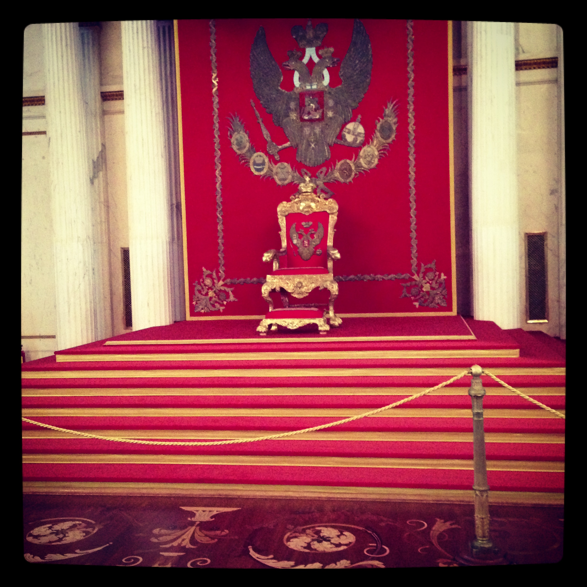 Der Kaiserthron steht ebenfalls prunkvoll strahlend in rot mit dem Wappen der Romanows in der St. George´s Hall.