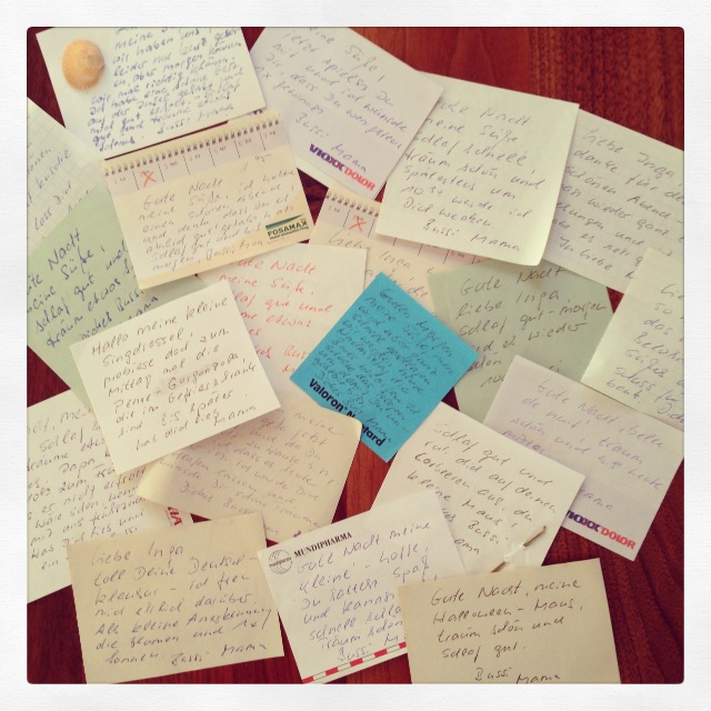 Lange habe ich hin und her überlegt wie ich meiner Mutter danken kann und was genau ich euch dazu erzählen möchte. Als ich so meine Schubladen und Kisten aufräumte fielen mir sofort zahlreiche Zettel in die Augen. Jedes Mal wenn meine Mutter das Haus verließ und ich noch schlief, oder ich nach einem Konzert später heimkam und sie schon schlief, hat mir meine Mutter kleine Post-Its und Zettel mit einer lieben und rührenden Botschaft hinterlassen. In jedem Abschnitt meines Lebens habe ich diese Zettel erhalten und gesammelt, da sie für mich der durchgehende Ausdruck der unglaublichen und unerschütterlichen Liebe meiner Mutter darstellen. Selbst wenn meine Mutter am Samstag nur eben zum Bäcker ging fand ich einen kleinen Zettel direkt vor meiner Zimmertür. An einen kleinen magnetischen Notizhalter mit einem Herz geklemmt, begleiten mich diese kleinen Liebesbotschaften auch heute noch. Wenn ich meine Mutter heute auf Sylt besuche, so kann ich sicher sein, dass wenn ich aufwache, ein kleiner liebevoller Zettel mit  der Aufschrift – Guten Morgen meine Süße, ich bin schnell zum Bäcker und gegen 11 Uhr wieder zurück. Bussi Mama – auf mich wartet und mir den Morgen versüßt.