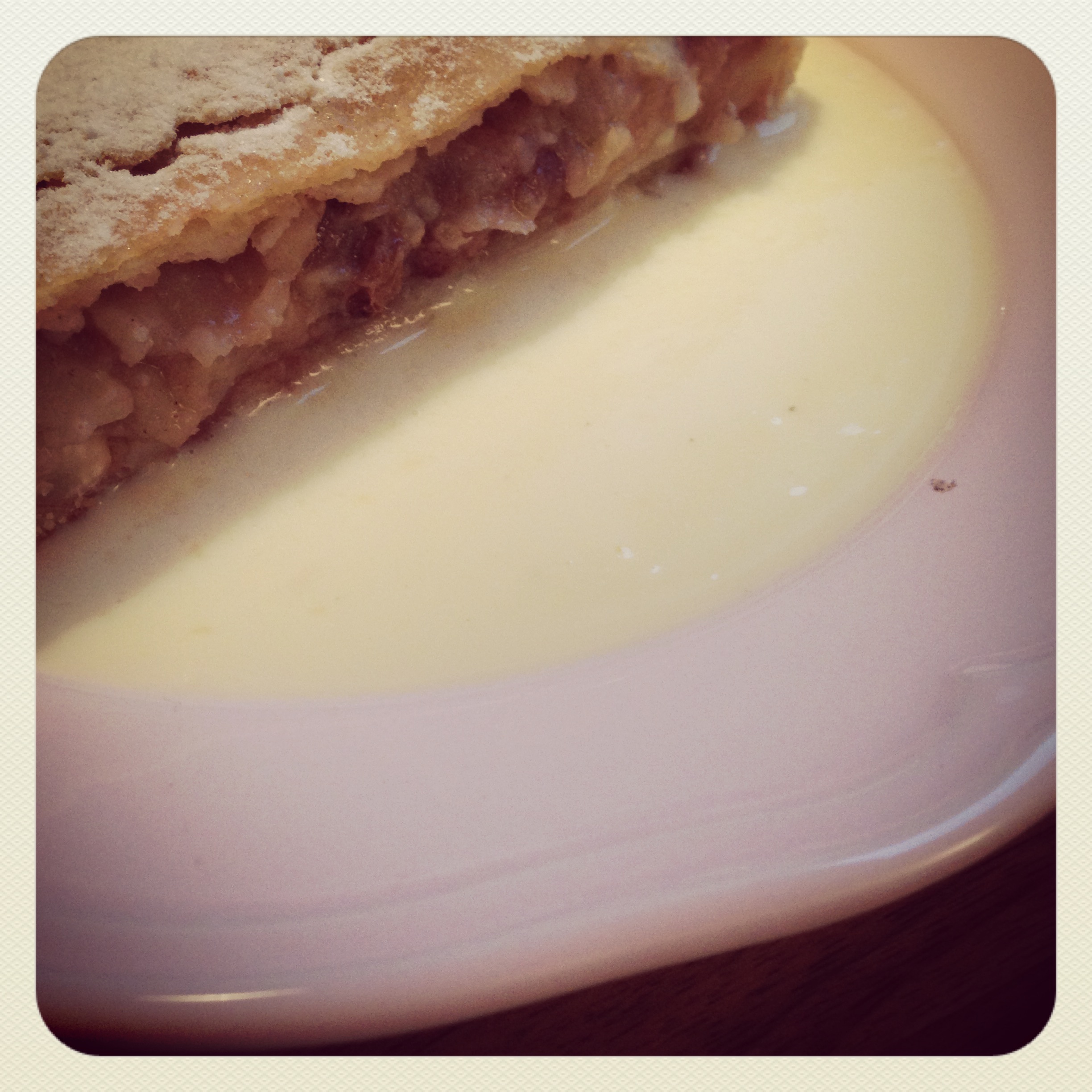 Apfelstrudel hat in meiner Familie eine lange Tradition. Schon meine Wiener Großmutter hat bei jedem Besuch den herrlichsten Apfelstrudel gebacken und auch mein Papa steht ganz in dieser österreichischen Tradition und hat jedes Jahr zum Beginn der Weihnachtszeit die Küche okupiert, das Strudelbrett rausgeholt und uns komplett verbannt, denn Strudel kann nur eine Person machen. Angezogen von dem Duft nach Zimt, Korinthen und Äpfeln schlichen meine Schwester und ich ungeduldig vor der Küche rum, versuchten auf den Teig zu lünkern, um zu sehen ob dieser schon fertig ist, schauten immer wieder neugierig auf den Ofen, ob dieser schon vorgeheizt war und waren glücklich als wir sahen, dass die Vanillesauce köchelte und die geschmolzene Butter fast alle war, denn das bedeutete, dass der Apfelstrudel bald fertig sein musste.