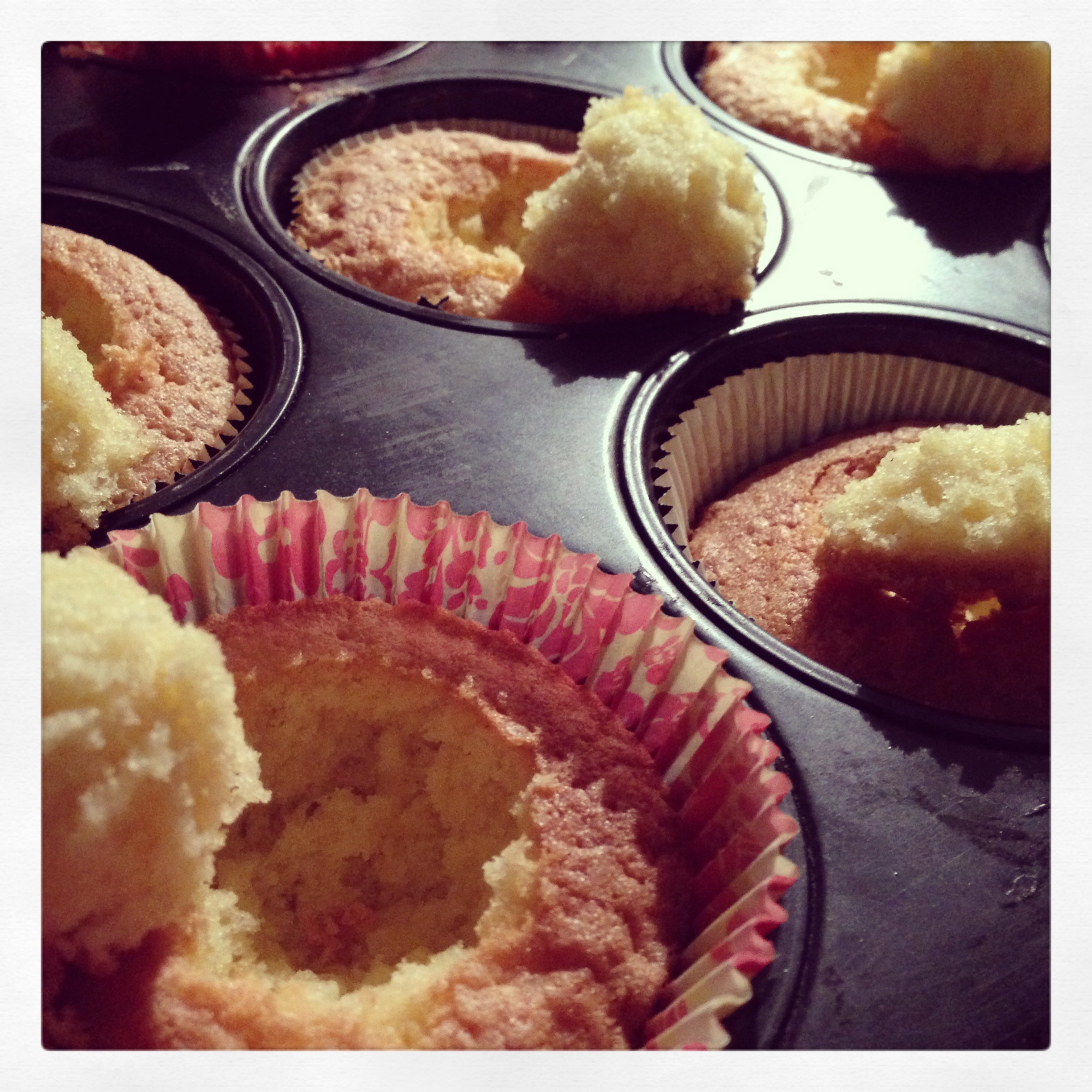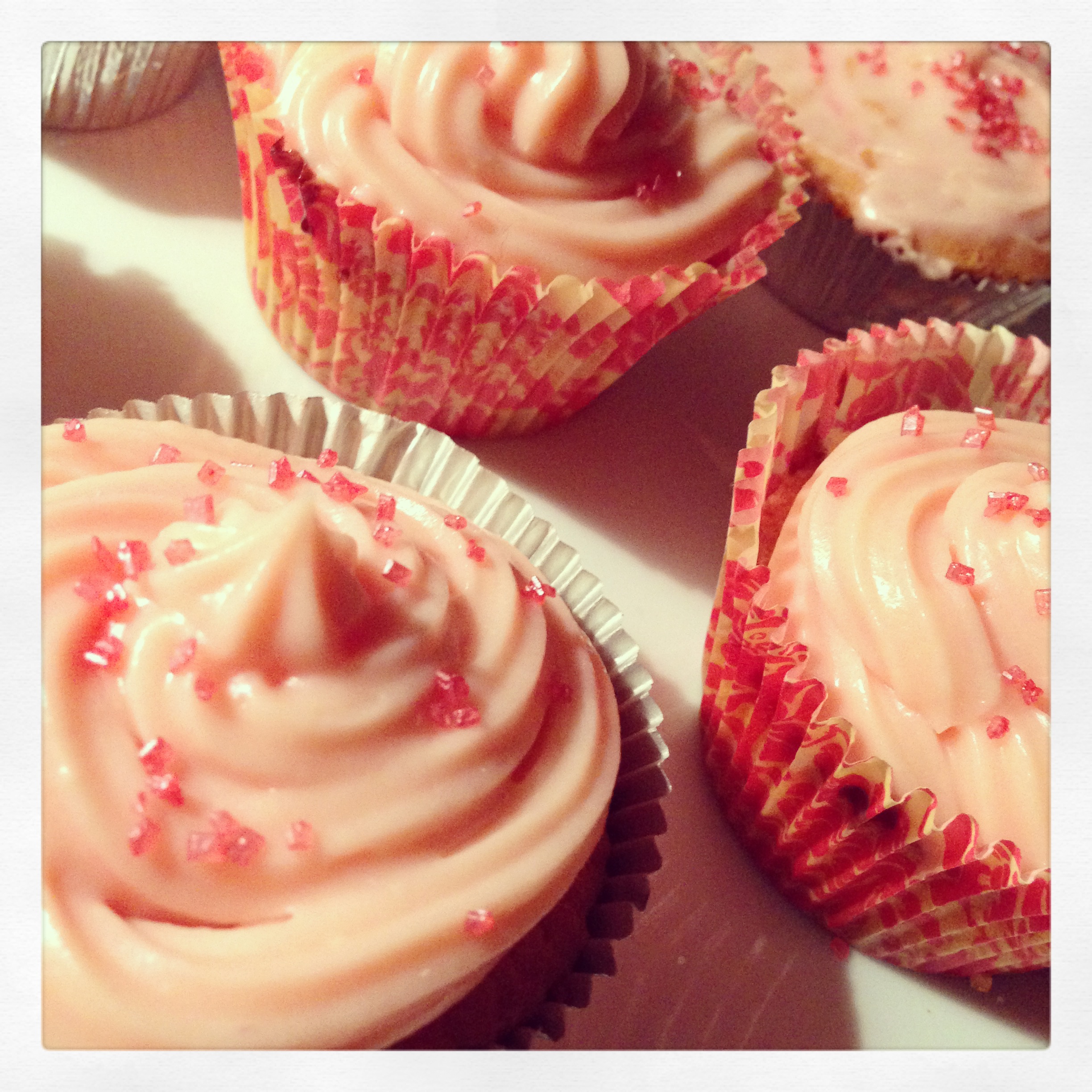 Ich habe das ganze in Cupcakes umgewandelt, indem ich herrliche Vanille Cupcakes mit einer Schokoladen- Rum- Marmeladenfüllung gespickt und diese mit einem rosa Häubchen verziert habe.