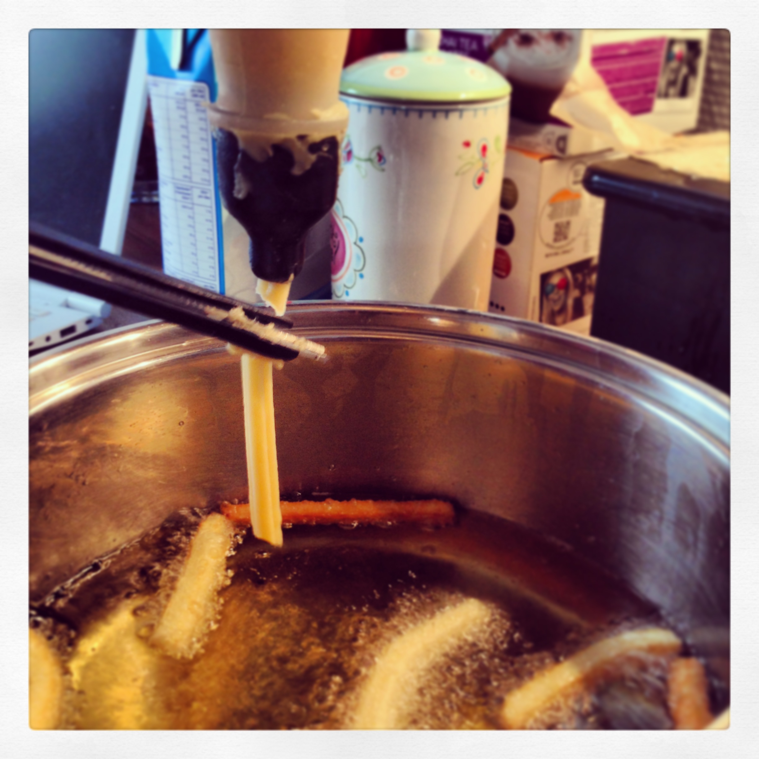 Den Teig wieder in einen Spritzbeutel mit Sterntülle füllen und den Spritzbeutel direkt über das Fett halten. Den Teig rausdrücken und mit einer Schere immer ca. 5 cm lange Streifen abschneiden und diese ins Fett fallen lassen. Die Churros goldbraun ausbacken und ebenfalls auf Küchenpapier abkühlen lassen.