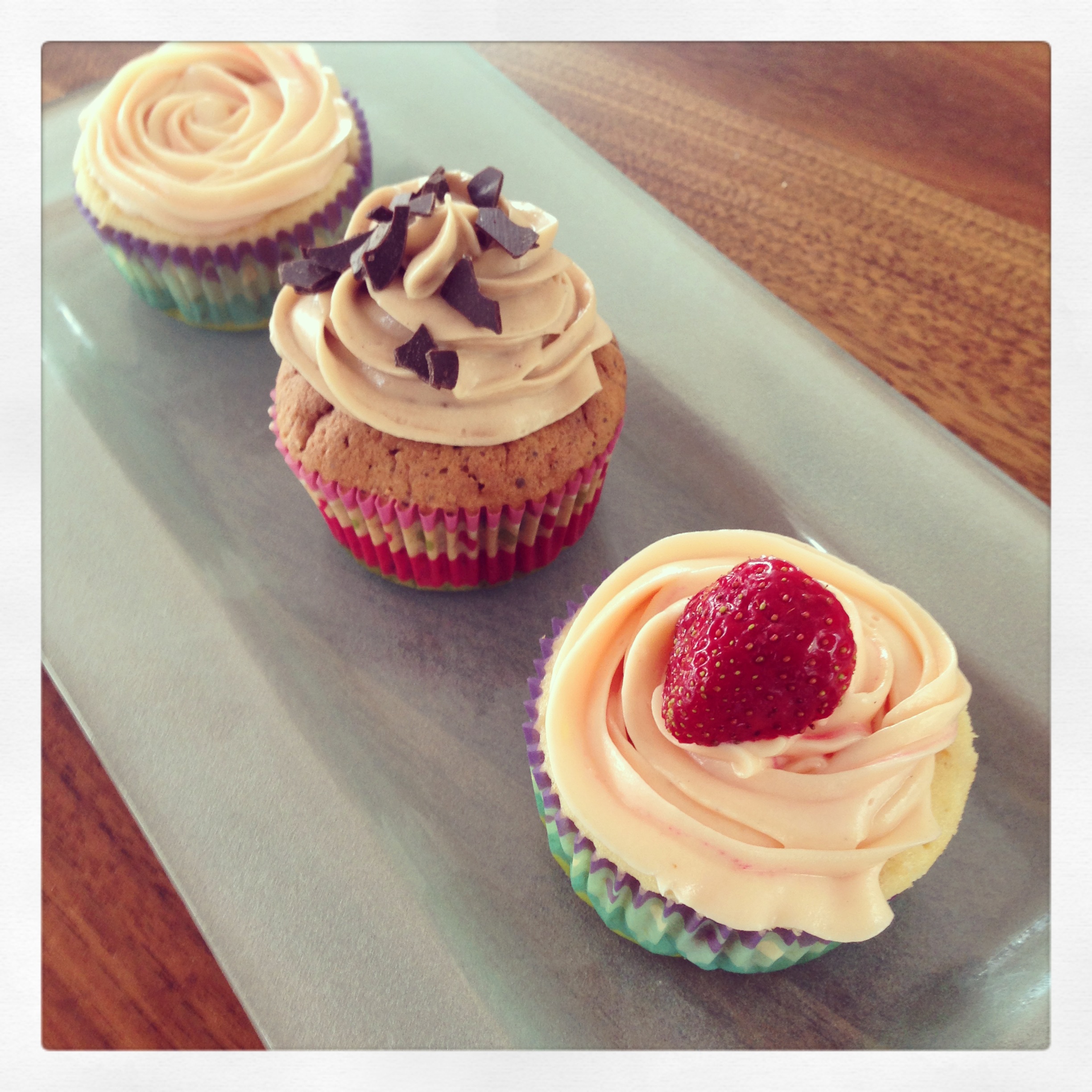 Die fertigen Cupcakes aus dem Ofen holen und gut abkühlen lassen. Mit einem Spritzbeutel das Frosting auftragen und die Cupcakes mit halbierten Erdbeeren und Schokoraspeln dekorieren.