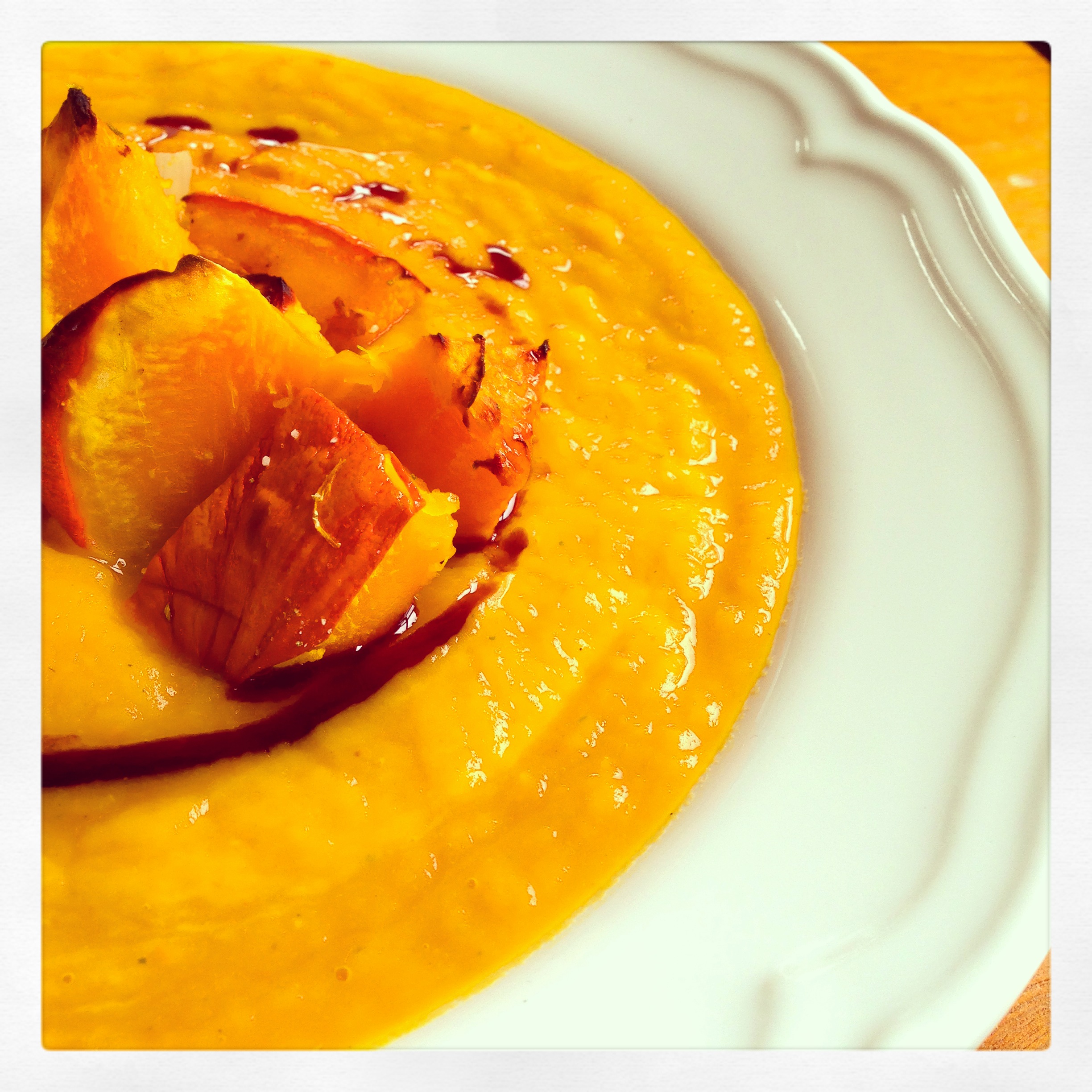 In der Zwischenzeit müsste auch das Röstgemüse gar sein, was ihr an der leicht braunen Kruste am Kürbis seht. Die Suppe in tiefen Tellern anrichten, einen guten Esslöffel vom Gemüse in die Mitte geben und abschließend etwas Kürbiskernöl drüber träufeln.