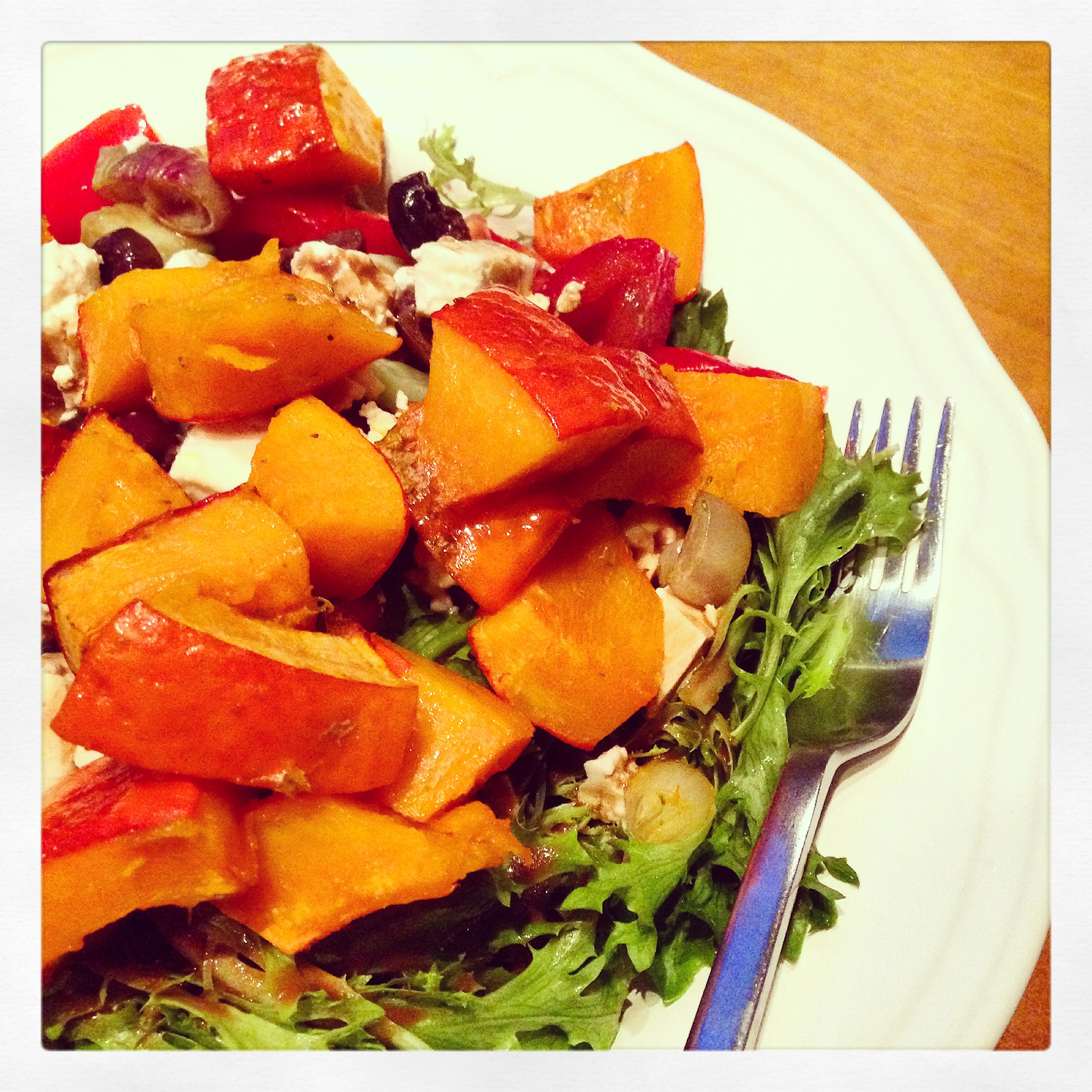 Wer etwas mehr Röstkürbis macht, kann diesen auch wunderbar auf Salat essen. Ich nehme dazu frische Pflücksalate, Kalamata-Oliven, Schafskäse, Tomaten, Gurken und eine Weißwein-Vinaigrette.