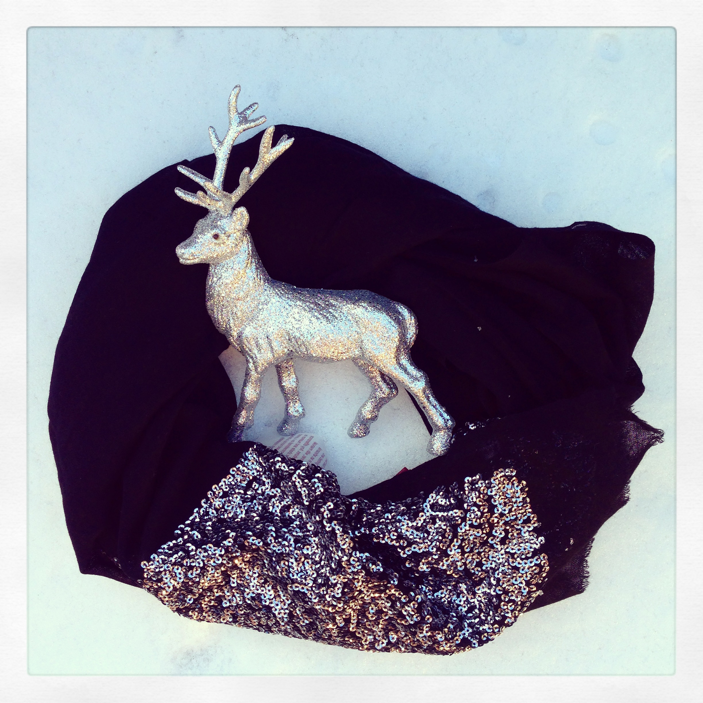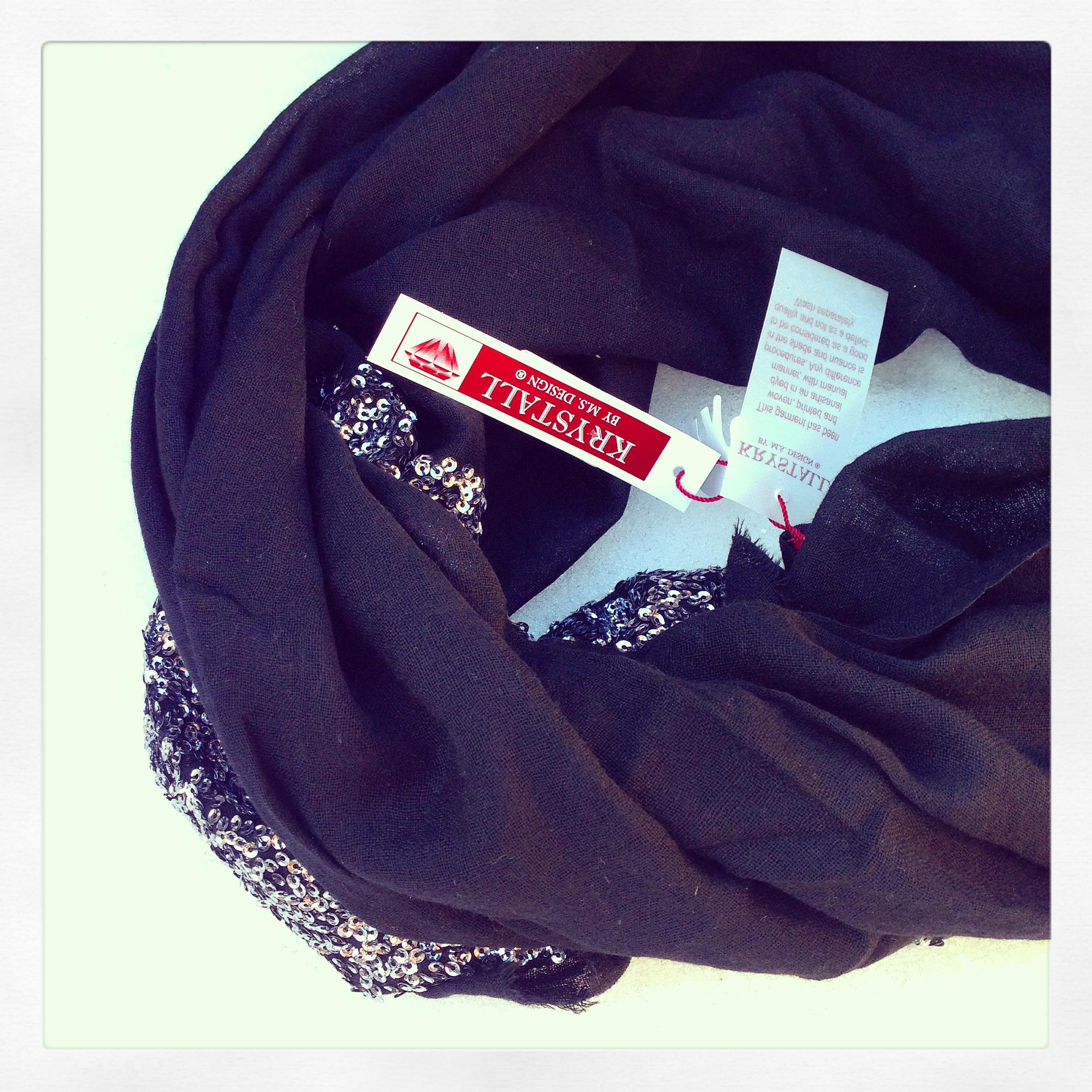 Ich habe das Tuch zwar bereits Weihnachten ausgepackt – danke nochmal an Krystall, dass ihr mir dieses kostenlos zur Verfügung gestellt habt – aber ich werde es erst in ein paar Tagen zu Silvester tragen und zwar als Stola, leicht über den Schultern drapiert, zu einem schlichten schwarzen Kleid mit kleinen Lederapplikationen und schwarzen Pumps. Das Tuch hat einen solchen Charme und eine Strahlkraft, dass der Rest der Garderobe gar nicht auffällig sein muss, sondern eher dezent und klassisch.