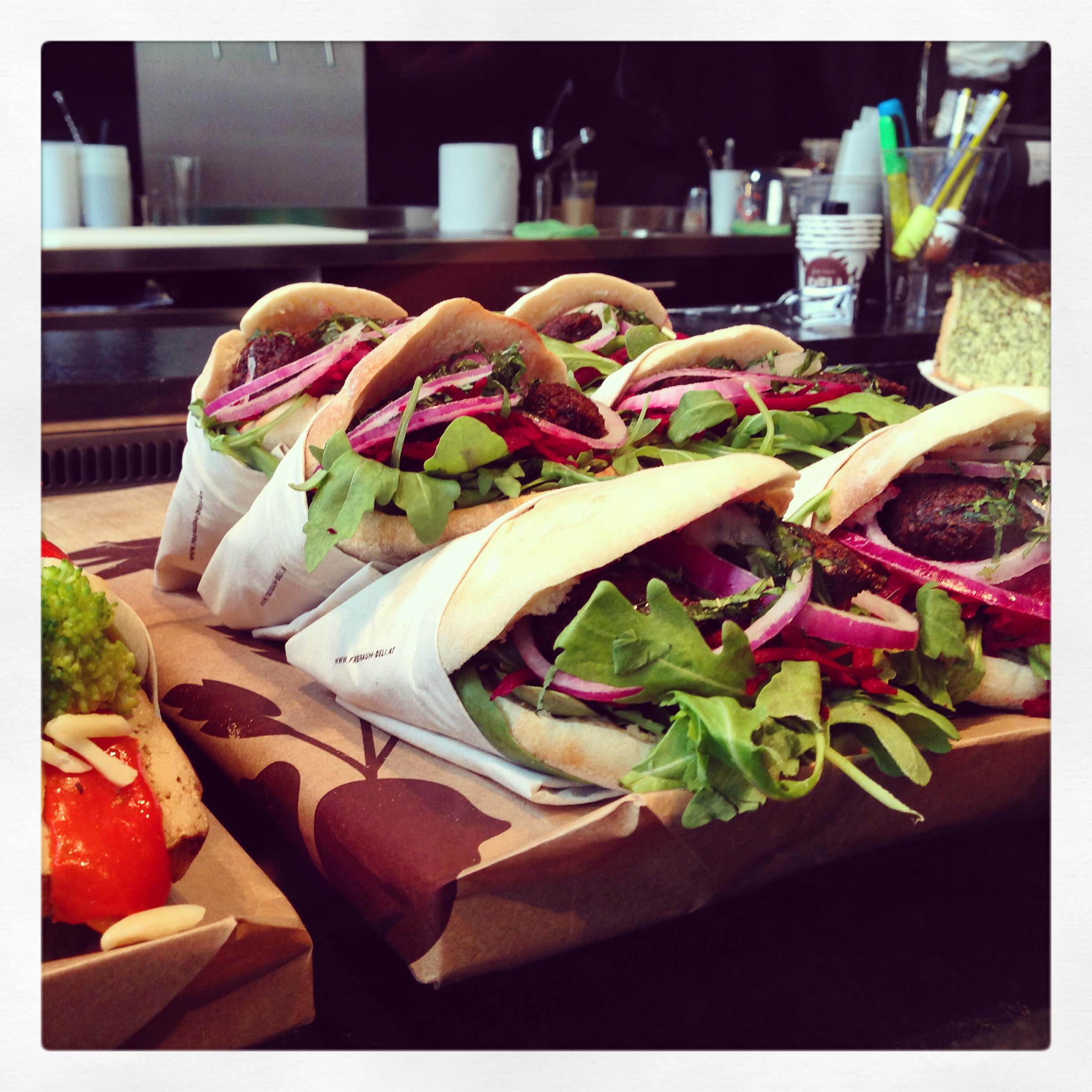 Leckeren Tee und orientalische Spezialitäten wie Falafelwraps und Schawarma gibt es bei Dr. Falafel, der dank des orangenen Schriftzugs nicht zu übersehen ist.