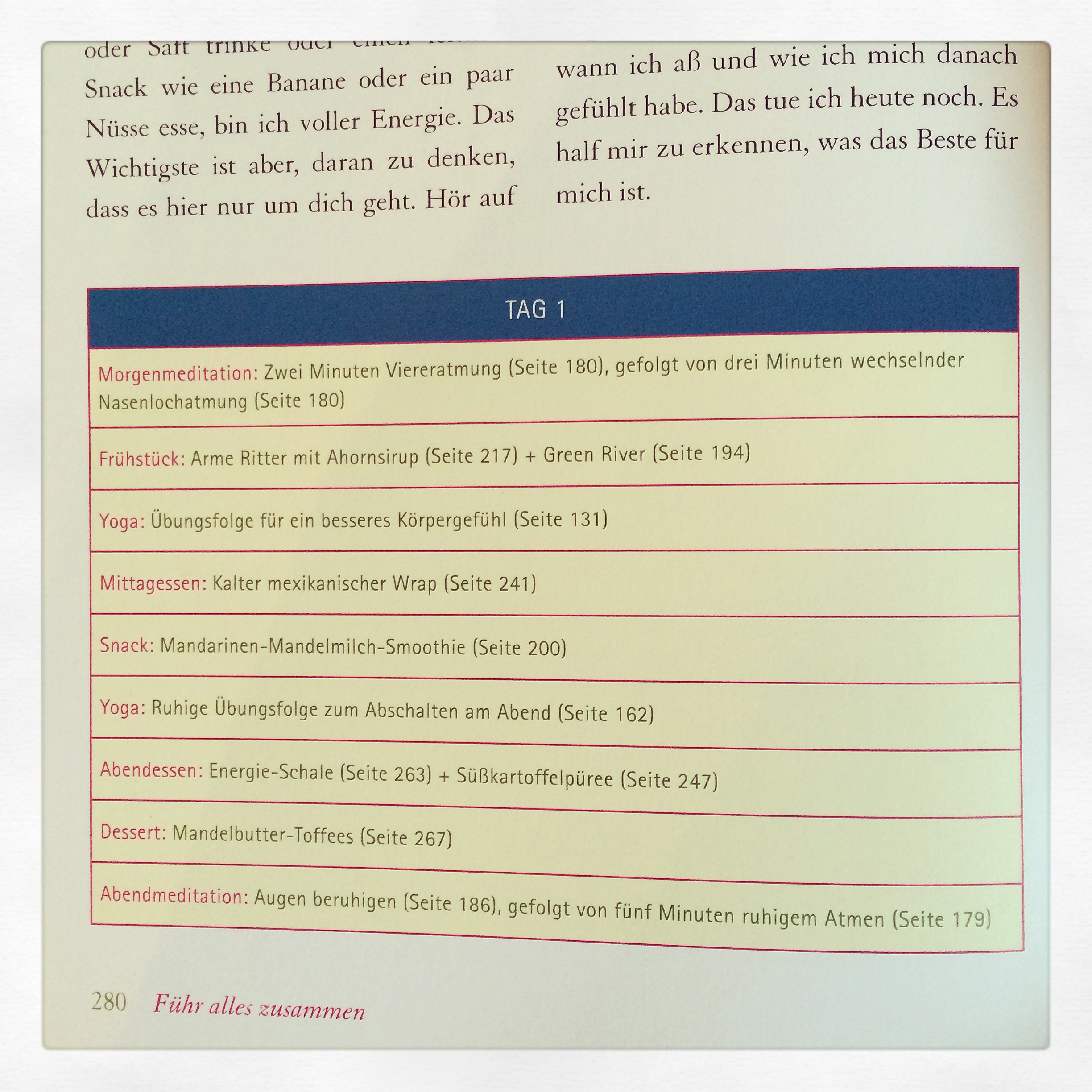 Am Ende des Buches findet man dann die zwei Programme, die einem helfen, durch eine konkrete Anleitung, eine Woche oder sogar einen Monat (30 Tage) sein Leben umzustellen. Beide Programme sind super ausgestaltet, mit einem konkreten Tagesablauf unter der Angabe der Seiten für die Übungen, Rezepte und Phasen. Ich habe es leider noch nicht geschafft, dass 7-Tage-Programm komplett zu testen, denn immer wieder kommt irgendetwas dazwischen (Geburtstage, Feiern…). In den Pfingstferien im Mai gibt es aber keine Ausrede mehr für mich und dann werde ich das Programm Schritt-für-Schritt befolgen und euch natürlich gerne davon berichten.