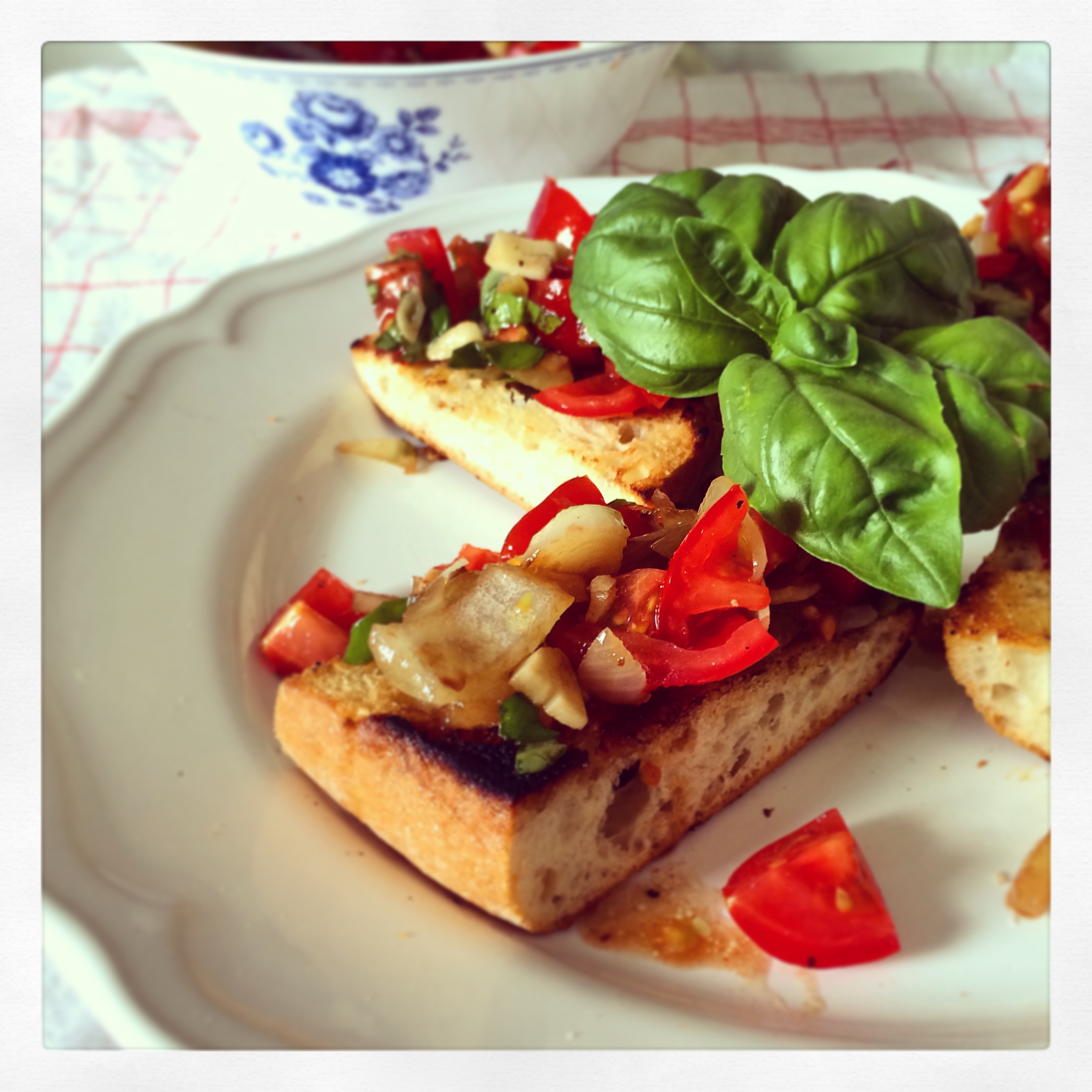 Noch gestern habe ich in einem Restaurant einen Gast gesehen, der vollkommen überteuertes Bruschetta aus drei dünnen Scheiben aufgebackenem Baguette, hellen Tomaten, einem Blatt Basilikum und (am allerschlimmsten) Crema die Balsamico aß. Das kann ich besser dachte ich mir und so wurde heute aus dem übriggebliebenen Pane Rustico und frischen Tomaten eine unglaublich saftige Bruschetta zum Mittag gezaubert, die ich euch nicht vorenthalten möchte. Hier also mein Rezept: