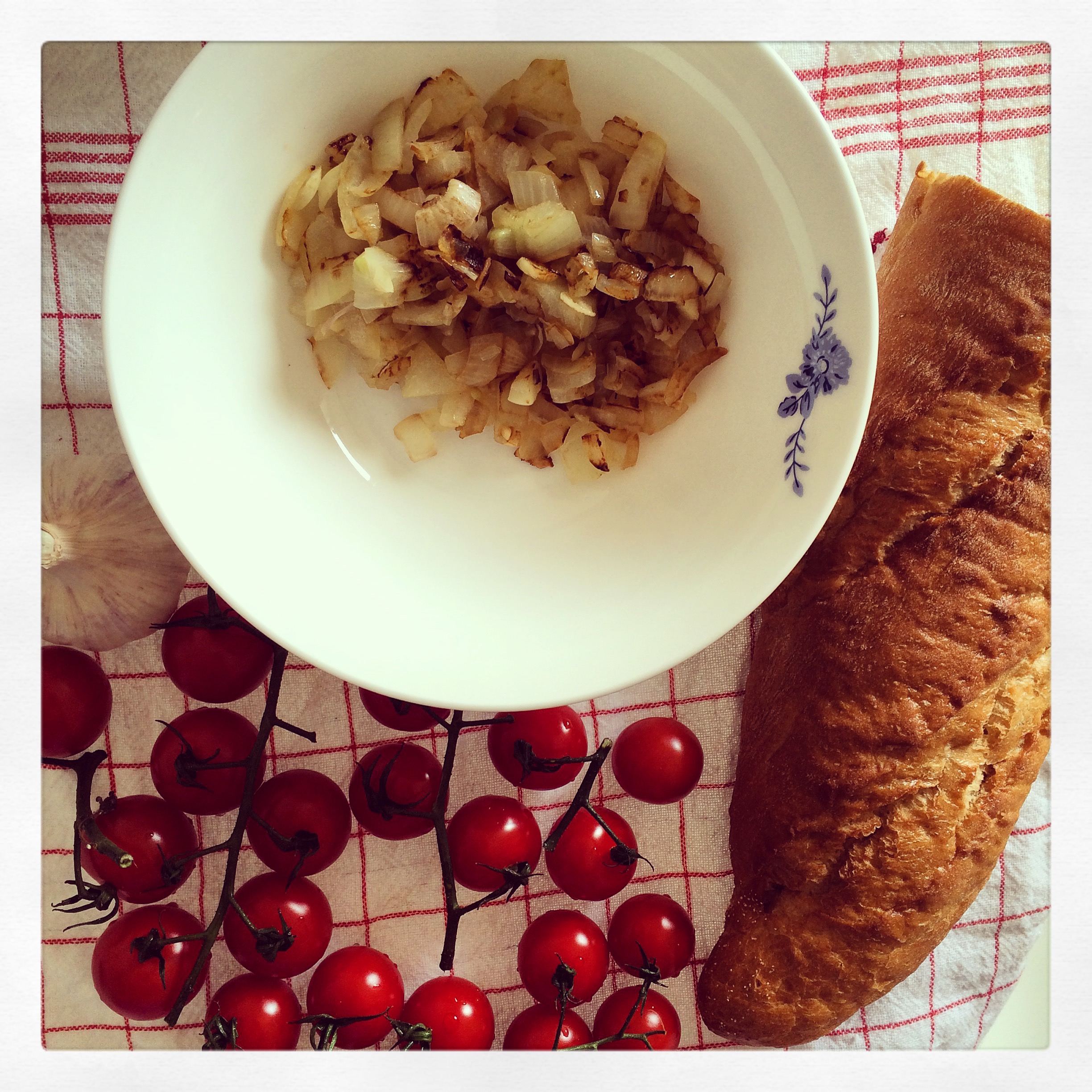 Zunächst werden die Zwiebeln und der Knoblauch in feine Würfel geschnitten. In einer beschichteten Pfanne etwas Fett (ich mische Butter und Olivenöl) erhitzen und die Zwiebeln und den Knoblauch braun anschmoren. Beides in eine Schüssel geben und kurz abkühlen lassen. Die Pfanne nicht abwaschen, sondern einfach zur Seite stellen, da ihr sie noch für das Brot braucht.