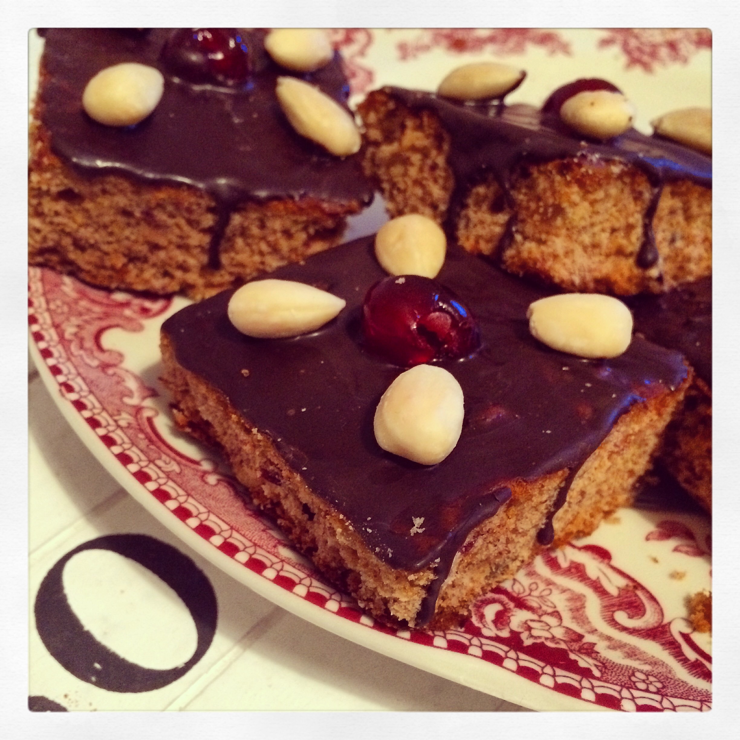 Die gebackenen Lebkuchen abkühlen lassen und danach in Rauten oder Quadrate schneiden. Abschließend die Zartbitter -Kuvertüre im Wasserbad schmelzen und die Lebkuchen damit bestreichen und mit einer kandierten Kirsche und vier blanchierten Mandeln klassisch garnieren.