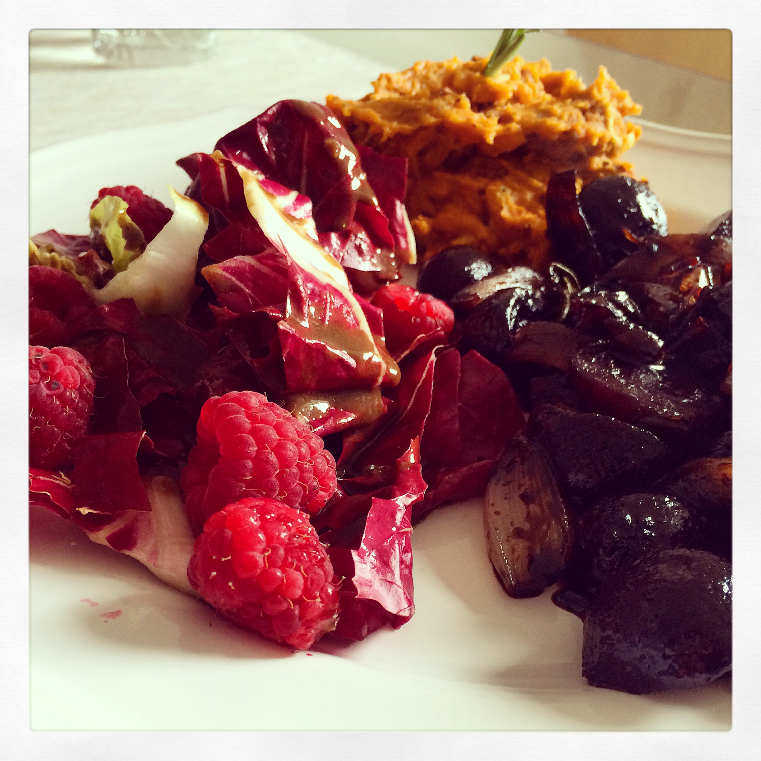 Heute möchte ich euch ein schönes (buntes) Rezept präsentieren, dass ich in den letzten Monaten öfter gekocht habe und das so herrlich unkompliziert ist und doch bei allen Gästen für Begeisterung sorgt. Momentan sind Süßkartoffeln ja ein richtiger Trend, obwohl es diese leckere orangene Knolle schon seit Ewigkeiten gibt und sie bei den Ureinwohnern Mittel- und Südamerikas seit jeher auf dem Speiseplan steht. In kaum einem Szenelokal oder einer Burgerbraterei kommt man um Süßkartoffelfries herum. Ich möchte euch aber eine andere Variante präsentieren, die weniger fettig und mindestens genauso lecker ist: Süßkartoffelpüree mit Chili. Zu diesem leicht süßlichen Püree passen süß-saure Balsamicoschalotten und ein leicht bitterer Radicchio mit Himbeeren ganz wunderbar.