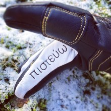 Wie kommt aber jetzt der Glaube ins Spiel fragt ihr euch zu recht. Ganz einfach, Angela hatte ein Handschuhmodell dabei, dass der Skirennfahrerin Lindsey Vonn gewidmet war und ich war so begeistert, dass ich den Handschuh anprobieren und genauer inspizieren musste. Angela sagte mir, dass Lindseys Tattoo auf der Innenseite des Handschuhfingers eingestickt war, ich las das altgriechische Wort Πιστεύω (altgr. pisteuo) und sagte sofort: Cool, da steht ja: Ich glaube! Angela war ganz überrascht, da bislang noch keiner aus dem Stand Altgriechisch gelesen hatte, als ich ihr erklärte, dass ich erstens Altgriechisch aufgrund meines Theologiestudiums beherrsche und zweitens selber das Wort Glaube auf meinem Handgelenk auf Latein (fides) eintätowiert habe. Zufälle gibts. Ab dem Moment war klar, dass ich genau diesen Handschuh noch für mein perfektes Outfit