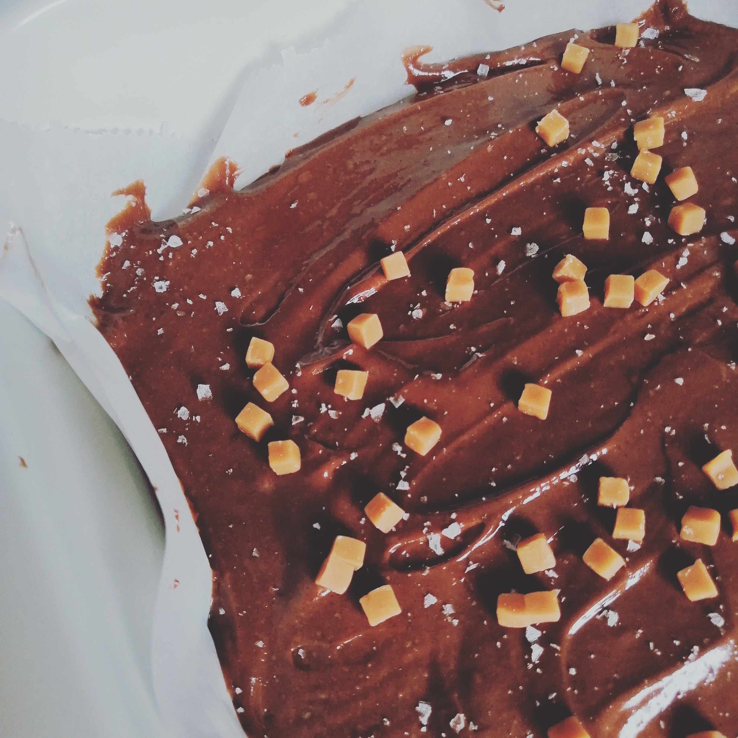 Jetzt das Meersalz, Mehl und Backpulver mit der gehackten Vollmilchschokolade vermischen und unter den Teig heben. Den Teig in eine beschichtete rechteckige Browniebackform füllen, mit den Karamellwürfeln bestreuen und je nach Geschmack das Meersalz über den Brownie streuen und den Kuchen dann 30 Minuten auf der mittleren Schiene backen.